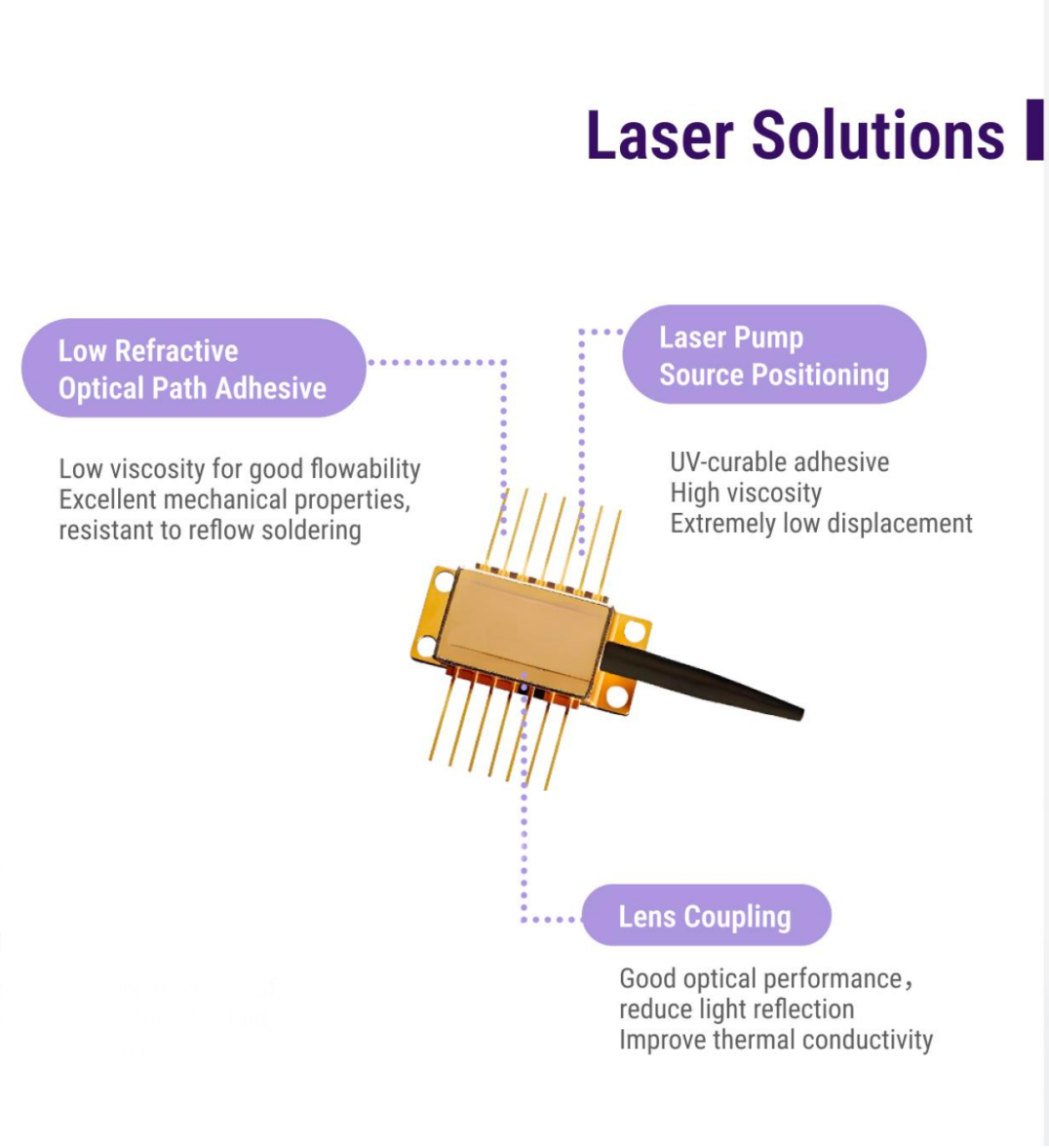 Among them, the coupling positioning of the FAC fast-axis collimating lens is crucial for laser intensity. Therefore, there are specific requirements for the UV glue used here. AlphaPro's OCX37 UV-curable adhesive, with its high viscosity, precise fixation, heat resistance, rapid positioning, and minimal displacement, is widely applied in the positioning of laser-pumped sources such as FAC and SAC.