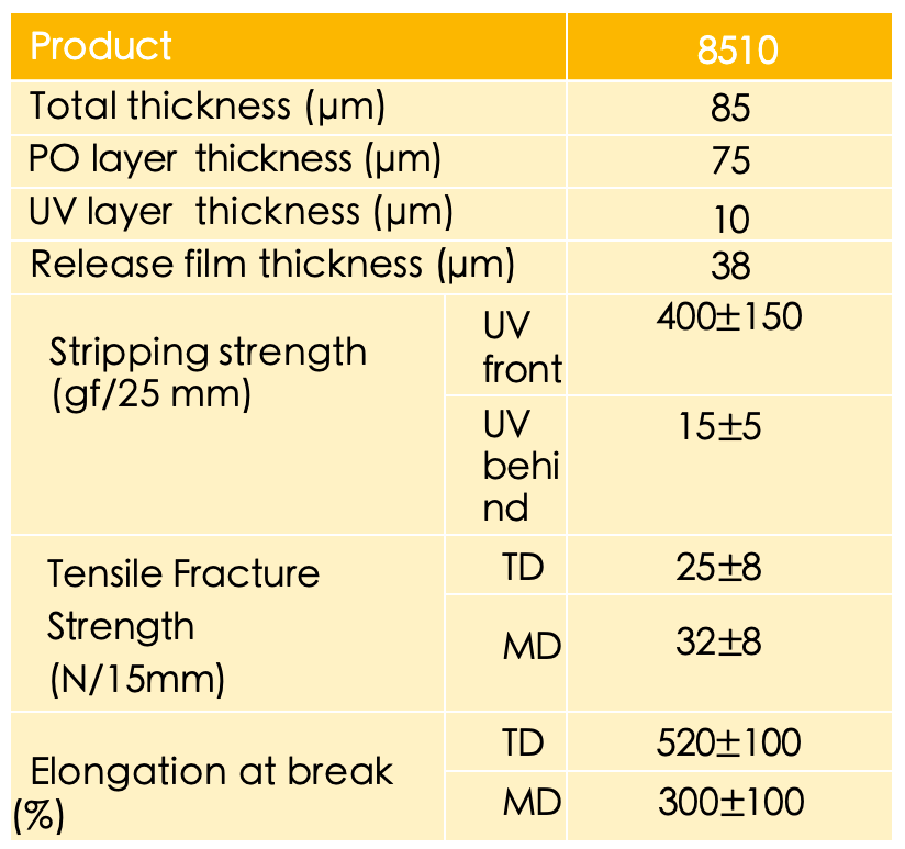 Applied to the front of the wafer (with circuit area), in the grinding and thinning process, protect the chip circuit from foreign damage, effectively prevent cracking, cracks and dirt problems.