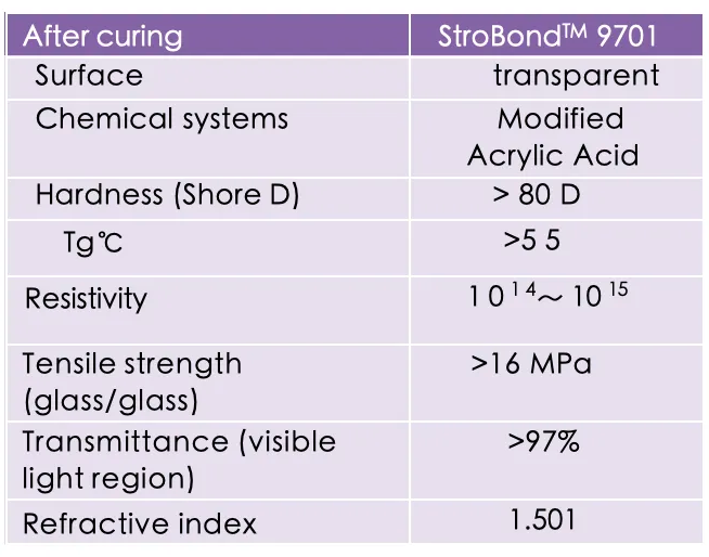In optical systems such as AR glasses, StroBond's single-component UV curing adhesive 9701 can achieve the most demanding requirements in optical device bonding applications: