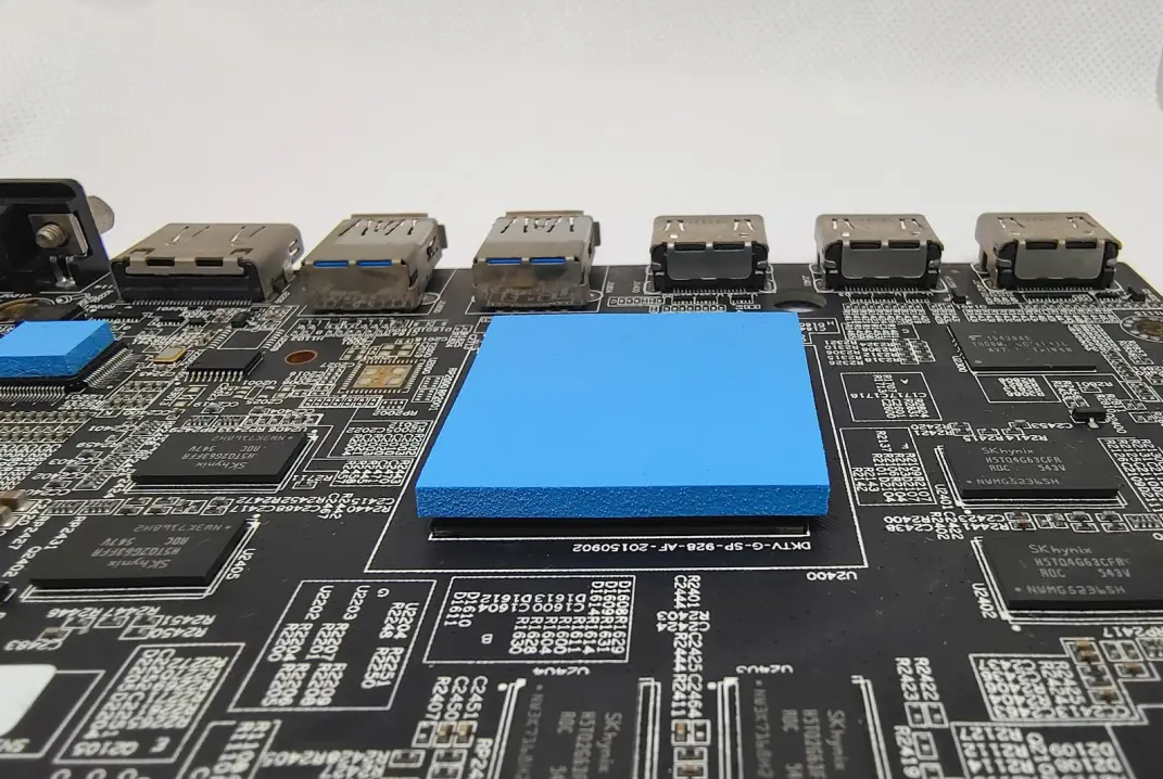The motherboard CPU chip and inductor element of a well-known projector product use A lpha P roTMThermal conductive mud 5403 is directly connected to the heat sink. Compared to traditional thermal pads, thermal conductive mud can better fill gaps between non-planar surfaces. It has better plasticity compared to silicone grease, making it more suitable for filling larger gaps. This material excels in interface filling, forming a continuous thin layer on the surfaces of chips and inductors, ensuring a seamless and tight bond with the heat sink, thus enhancing heat transfer efficiency.